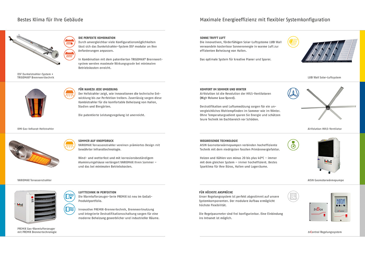 Im Kommissionierbereich: Sechs Dunkelstrahler DSF 40-4 mit Brennwertsystem TRIGOMAX beheizen diesen Bereich. Zusätzlich sorgen zwei AirVolution HYLS-Ventilatoren mit je 4.880 mm Durchmesser für eine Luftumwälzung von bis zu 200.000 m³/h. Im Bürobereich: Hier wurde eine AISIN Gasmotorwärmepumpe mit 56 kW Kühlleistung und 65 kW Heizleistung installiert. Die einzelnen Büros werden über 15 AISIN Deckenkassetten gekühlt bzw. beheizt.“